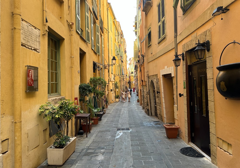 Vieux Menton sits above the main town and is a maze of narrow alleys lined with tall, faded yellow buildings.